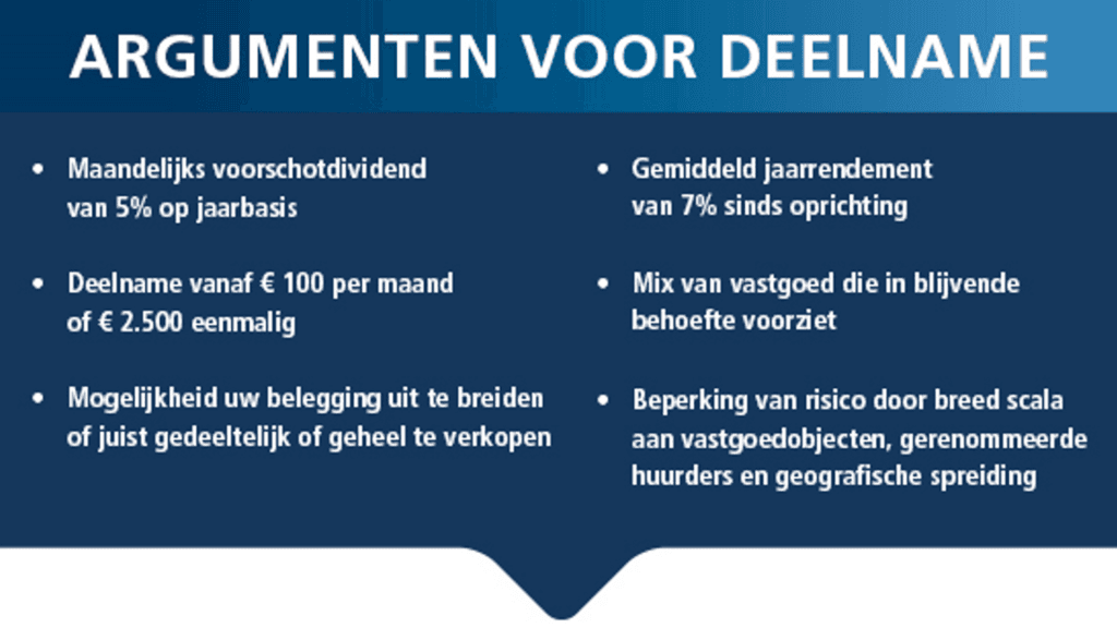 | Investeren vanaf: | € 100,- per maand, of €2.500,- eenmalig |