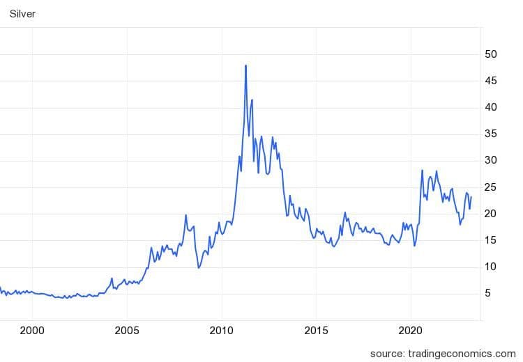 Onderstaande grafiek laat zien hoe de spotprijs van zilver (per ounce) de afgelopen 25 jaar is veranderd. De prijs van zilver is in deze periode gestegen van ongeveer €5 tot €22 per Troy ounce, maar de prijs ligt momenteel ver onder het hoogtepunt van €48 in 2011.