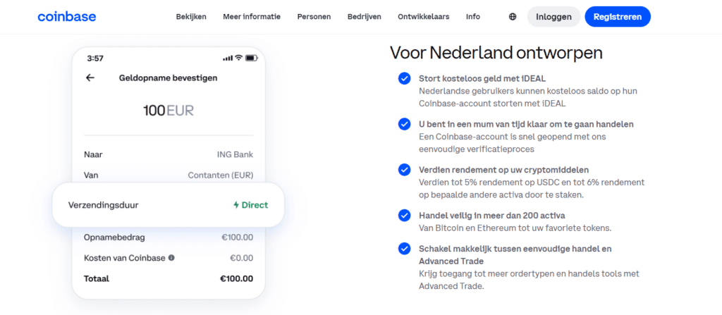 Coinbase is beursgenoteerd sinds 2021 en heeft ook een registratie bij de Nederlandse bank.
