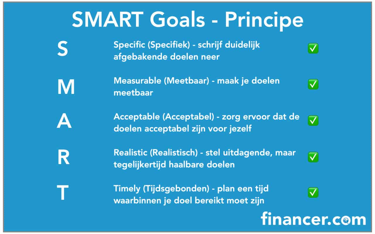 Een goede tip wanneer je financiële doelen stelt voor jezelf is door gebruik te maken van het SMART-goals principe. Dit is een Engelse afkorting die staat voor: