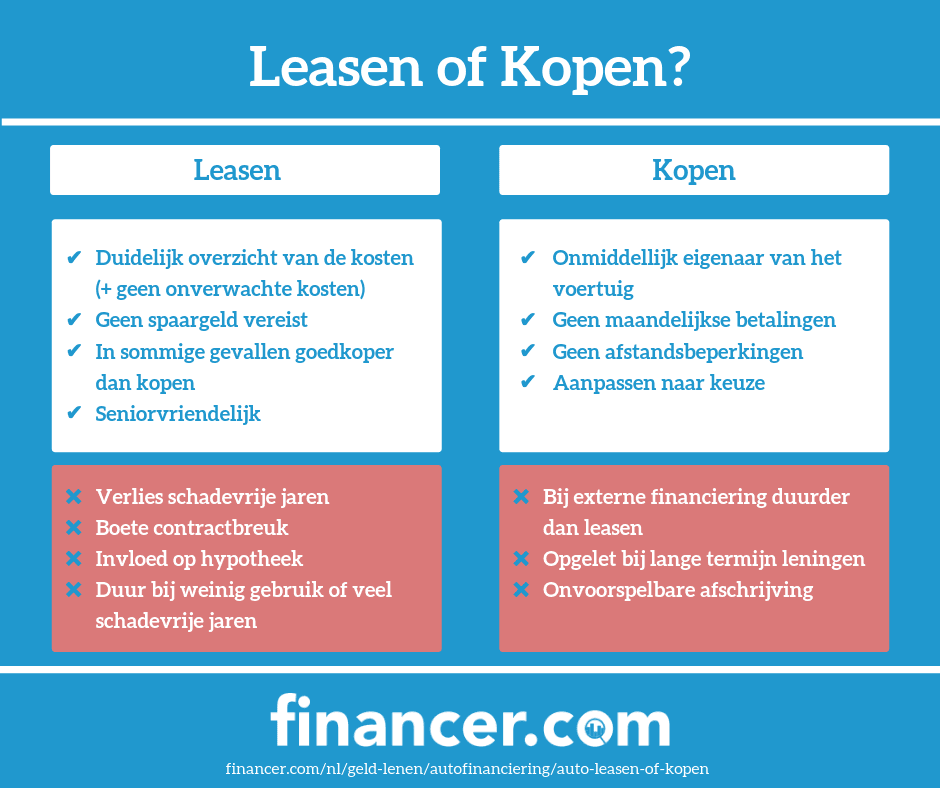 Hoe moet u kiezen? Een auto kopen, of leasen? Of kiest u beter voor een tweedehandsauto? Lees alles over de voor- en nadelen op Financer.com
