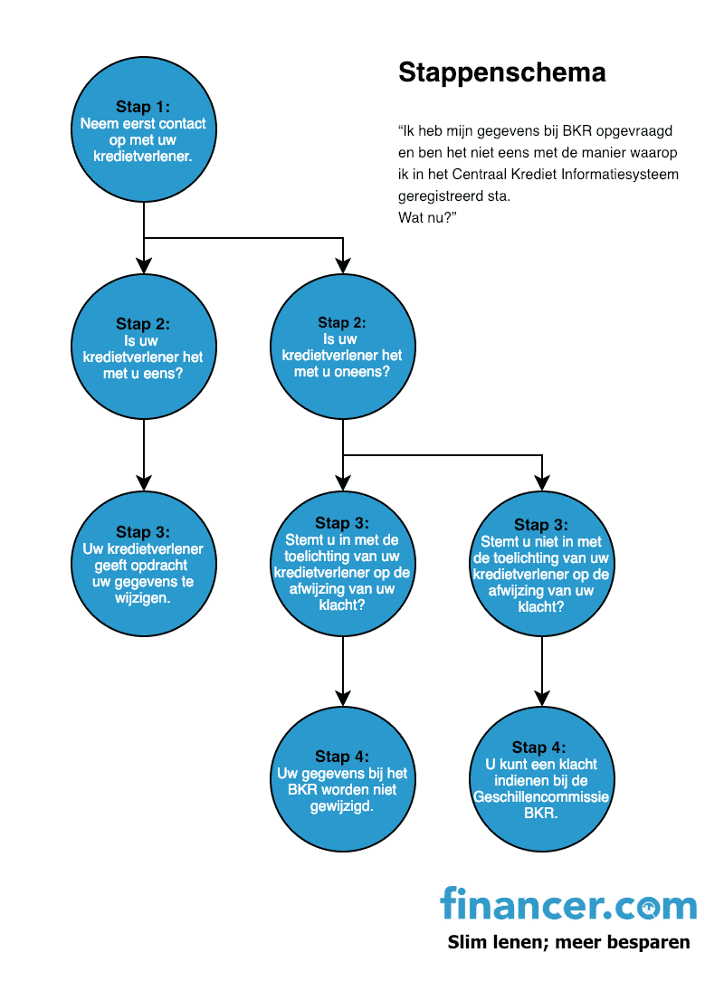 Stap 1: Neem contact op met je kredietverlener Schrijf een brief naar de kredietverstrekker en licht duidelijk toe✔️ waarom je het niet met de registratie bij BKR eens bent;✔️ op welke overeenkomst jouw klacht betrekking heeft;✔️ hoe jouw klacht volgens jou opgelost kan worden.