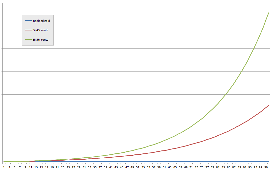Zie hieronder het voorbeeld van een inleg van 1000 euro, en 4 % en 5 % rente op jaarlijkse basis.