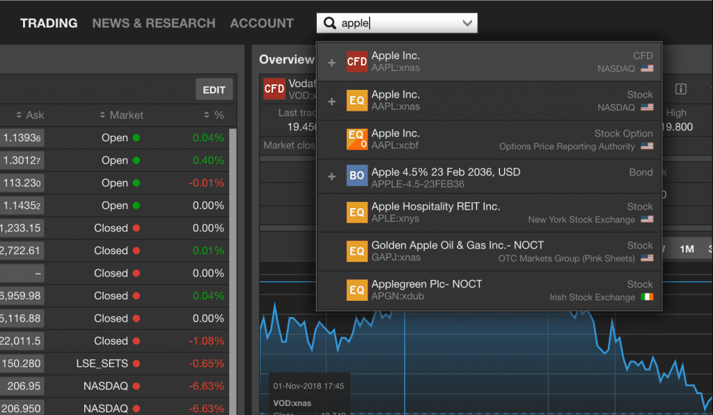 De zoekfuncties van Saxo zijn geweldig. De resultaten zijn relevant en gegroepeerd per beleggingscategorie. Als je zoekt op Apple, zullen de resultaten Apple aandelen en opties tonen.