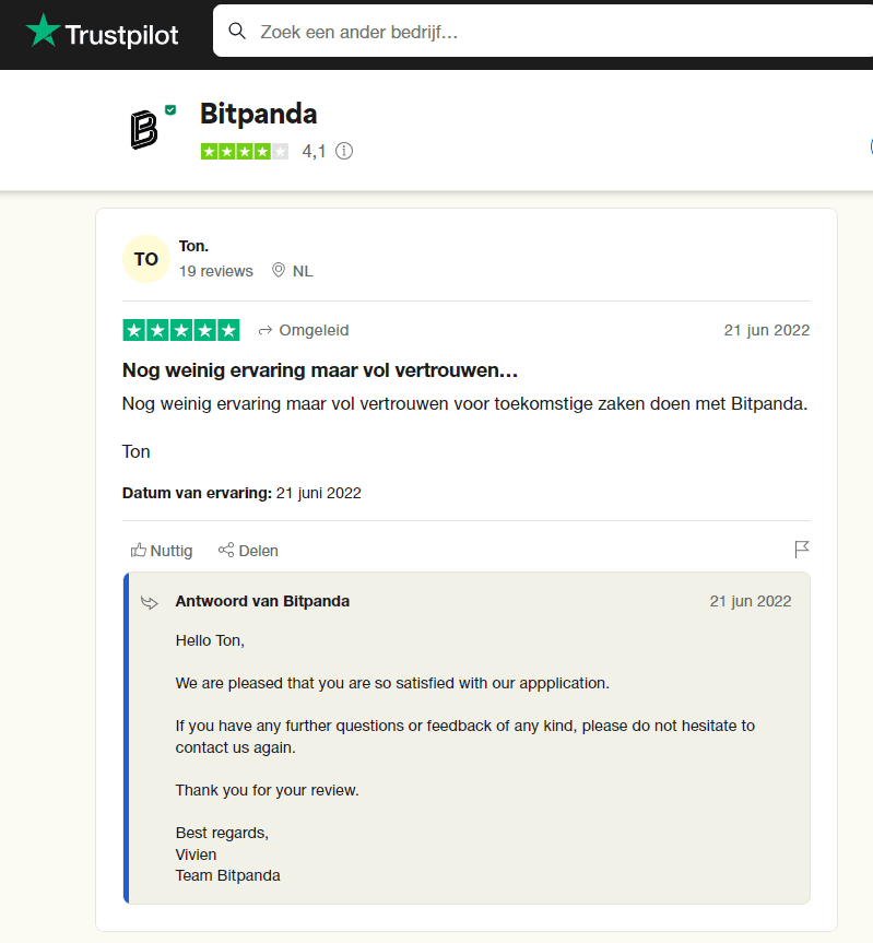 Elke review wordt netjes door Bitpanda beantwoord, en klanten lijken goed geholpen te worden.