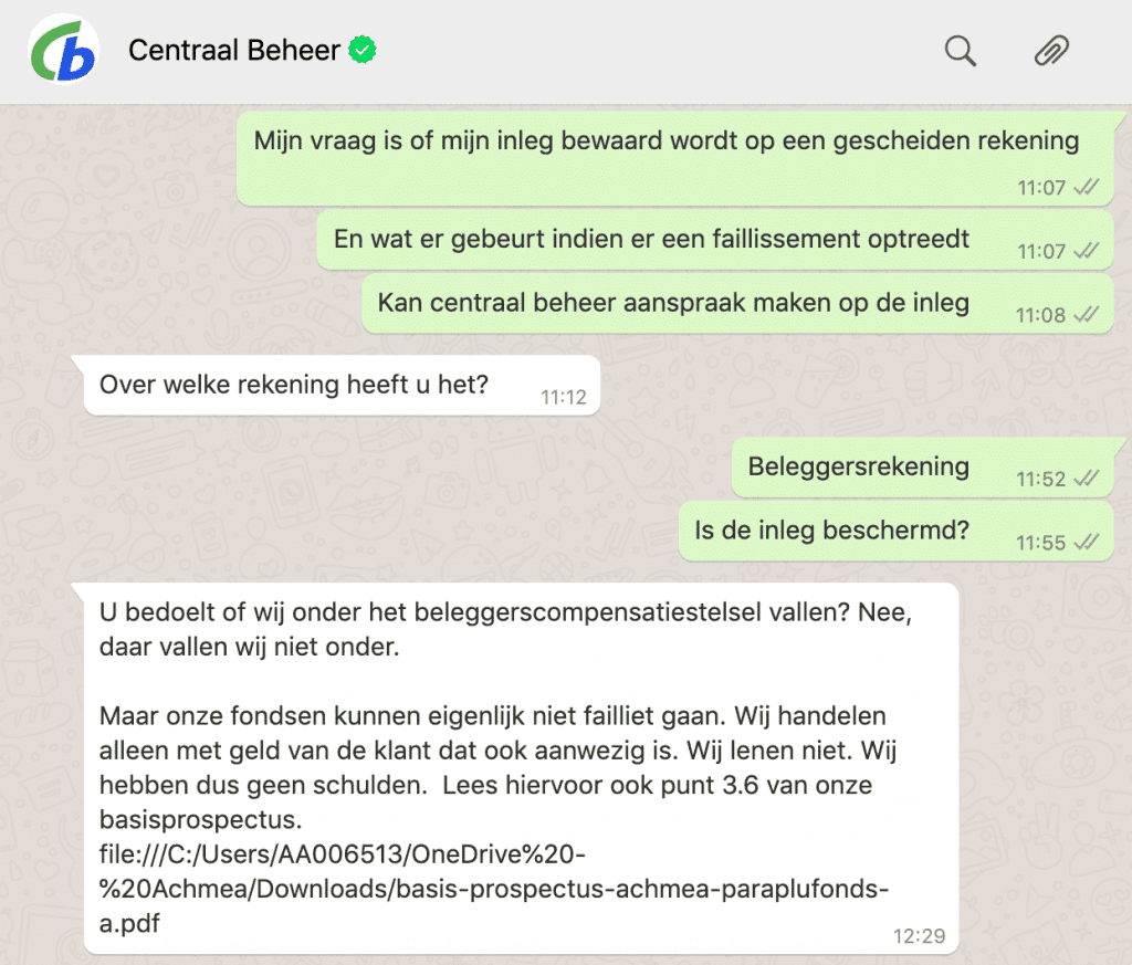 De beschikbare informatie op de website is some eerder beperkt, of moeilijk te vinden. In dat geval kan de WhatsApp klantendienst erg van pas komen. Het adres Centraal Beheer is hier eveens op te vragen.