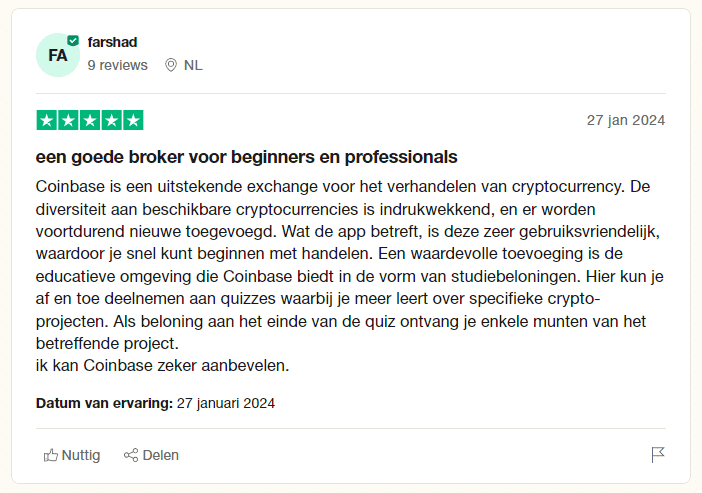 Onderstaand is een screenshot van een 5-sterren beoordeling voor Coinbase.