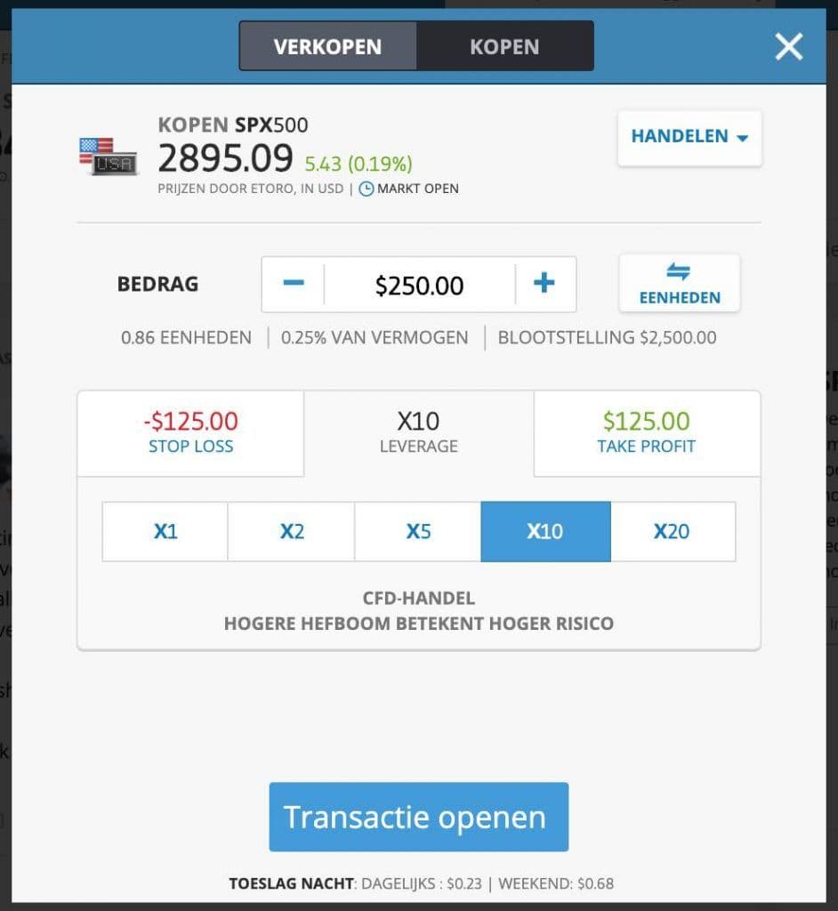 Daarnaast biedt eToro de mogelijkheid om een hefboom (CFD) te gebruiken, waardoor je met een relatief kleine inzet toch een grote positie kunt openen.