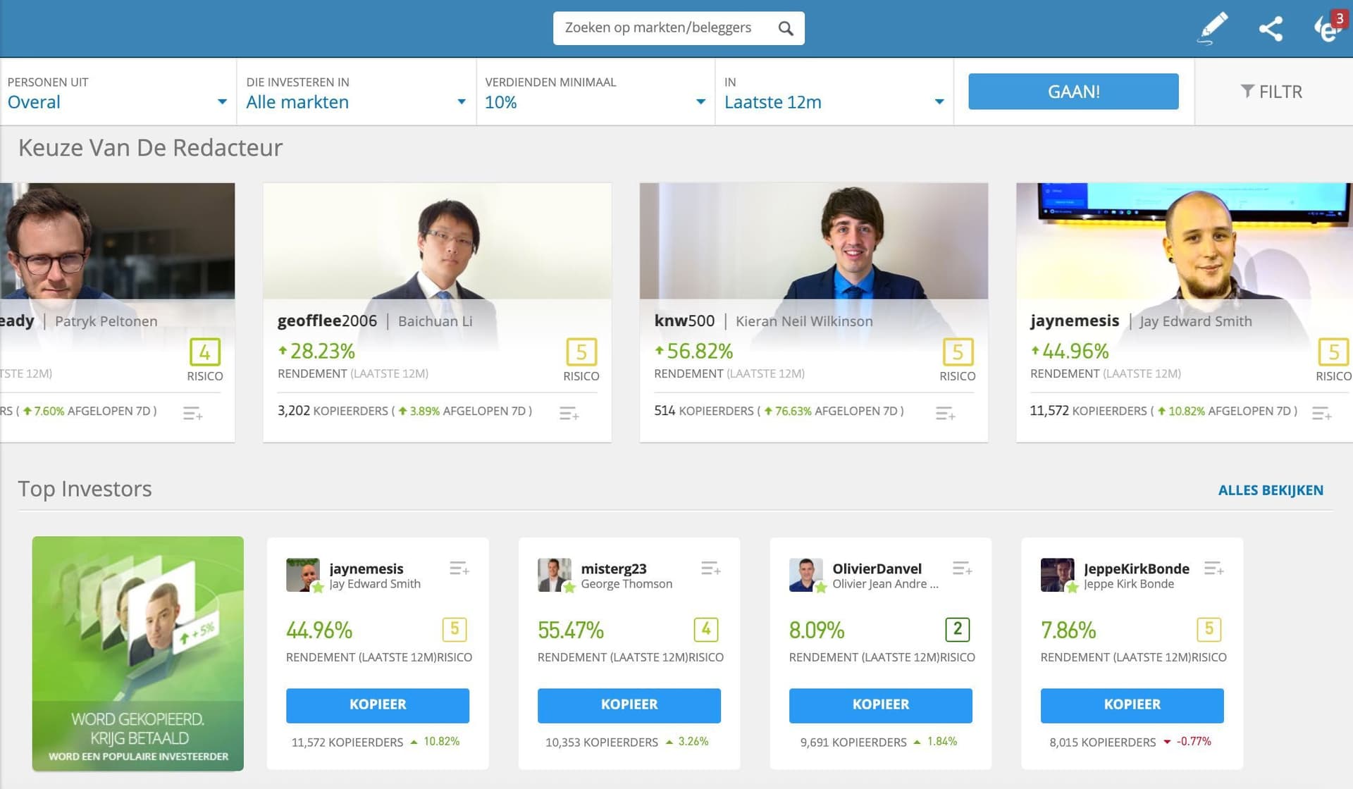 Hiervoor zijn er een aantal filteropties, zoals locatie, accountverificatiestatus (het is alleen zinvol om investeerders te kopiëren wiens account ‘geverifieerd’ is, dit zijn namelijk echte personen ipv 'bots'), gemiddelde risicoscore, beleggingsproducten, etc.