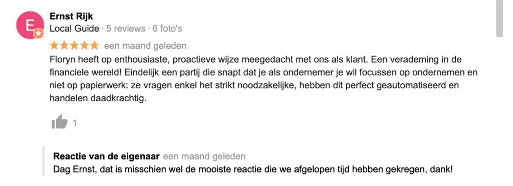 Slechts 10% van de reviews heeft 1 ster. De ervaringen zijn dus overwegend positief en Floryn neemt steeds de tijd om persoonlijk de reviews te beantwoorden: