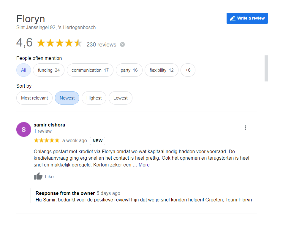 Floryn heeft op het moment van schrijven 230 Google reviews met een gemiddelde score van 4,6 uit 5 sterren. Op basis van deze Floryn review (s) wordt het bedrijf als bovengemiddeld positief ervaren.
