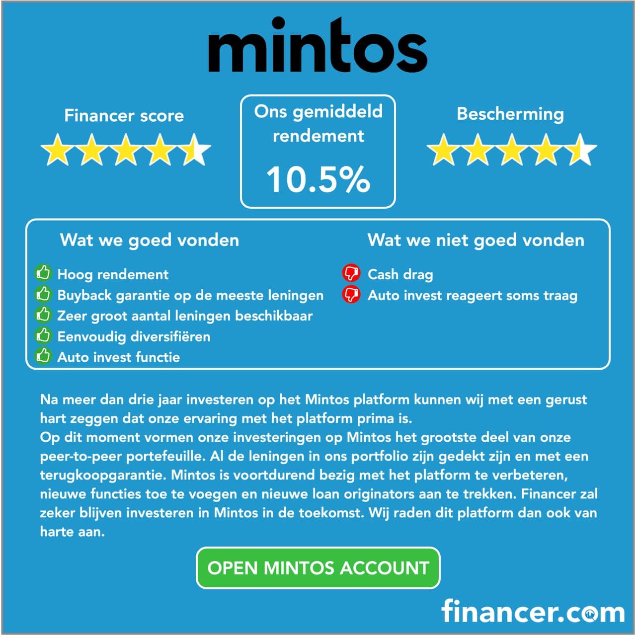 Zelf investeren we al meer dan 3 jaar via Mintos en hebben we aan de hand van onze ervaring een gedetailleerde review Mintos geschreven.