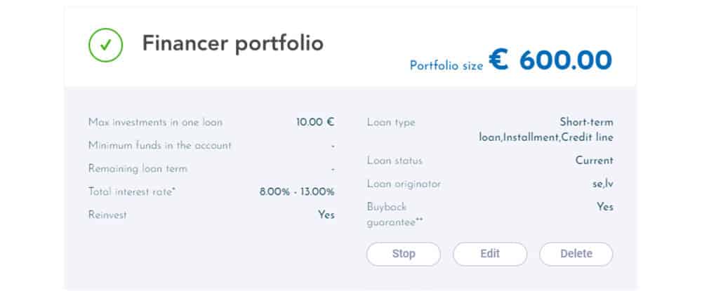 ❌ Geen secundaire markt.Indien u geïnvesteerd heeft in een lening, kunt u deze niet annuleren of doorverkopen. Sommige platforms, zoals Mintos, hebben een zogenaamde secundaire markt, waar u leningen kunt doorverkopen aan de hoogste bieder.