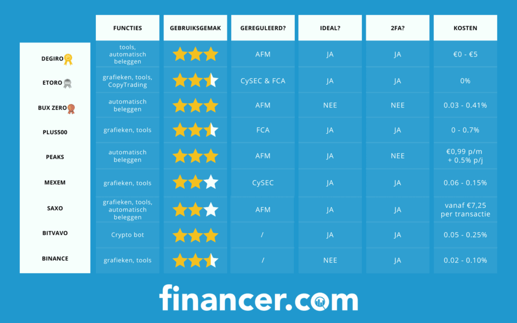 | 1.*eToro | 2. DEGIRO | 3. Bux ZERO | 4. **Plus500 | 5. Peaks | 6. MeXem | 7. Saxo Bank | 8. Bitvavo | 9. Binance | |